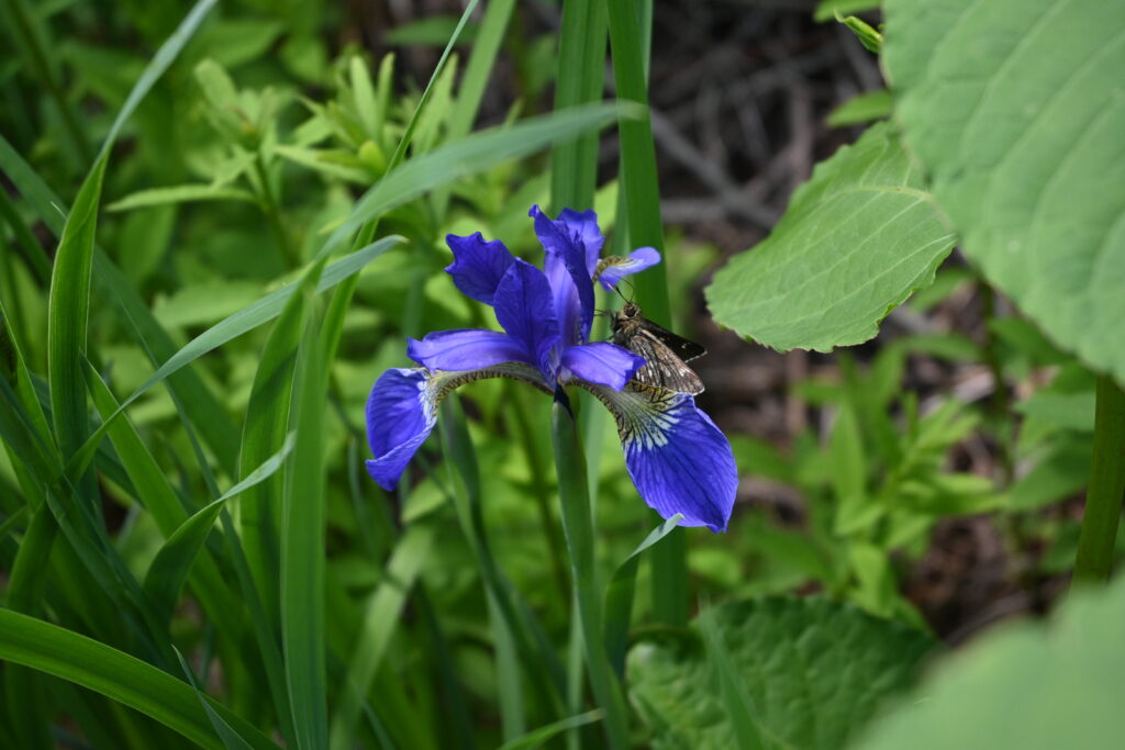 それはチョウ!こちらはアヤメに止まり蜜を吸うコチャバネセセリです。くりくりの大きな目が可愛いですね。