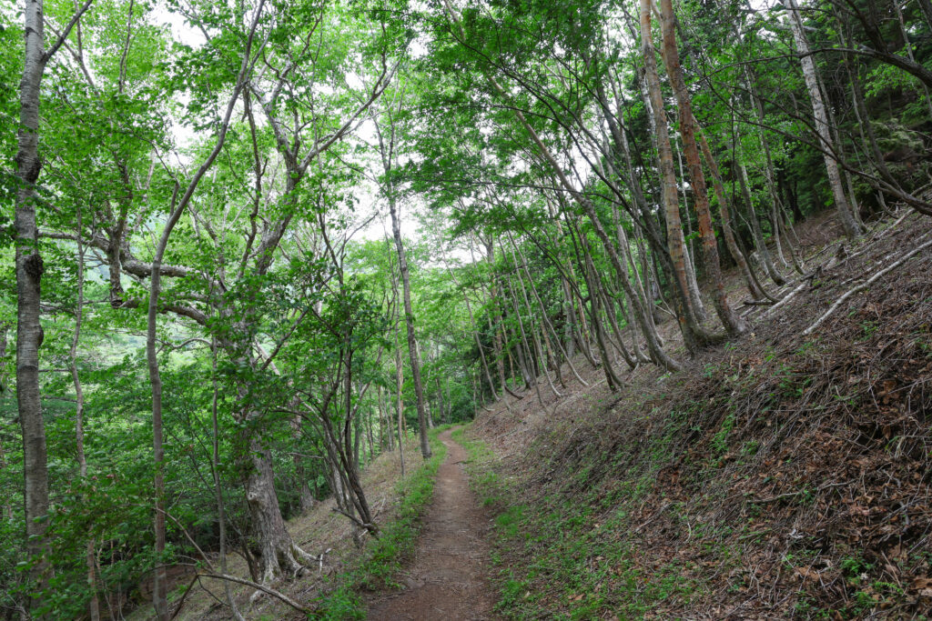 金精道路から小峠へ向かう道沿いは両側が急斜面で、深い谷地形になっています。