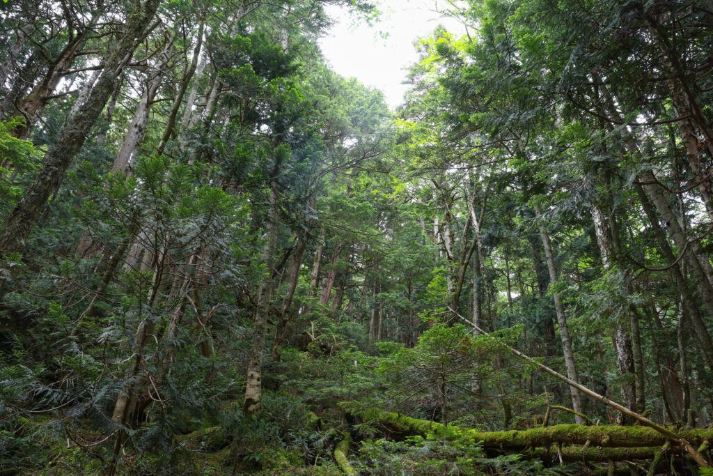 金精道路を出発してから40分程登った小峠を過ぎた辺りからは、シラビソやコメツガなどの美しい針葉樹林へと移り変わり、林床を覆う様に苔が生えた神秘的な雰囲気になってきました。