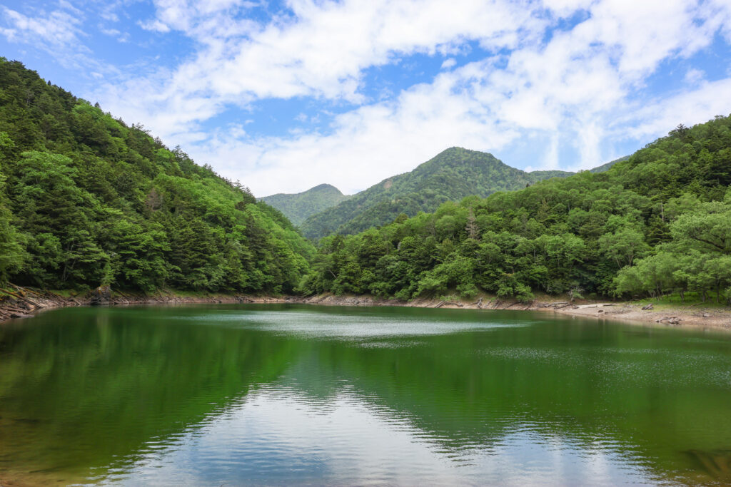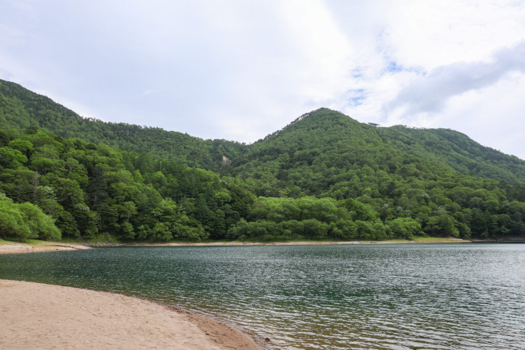 360°を山に囲まれた湖面はエメラルドグリーンに輝きて、時折涼しい風も吹き、森の中の雰囲気とはちがい、いつまでもゆったりしていたくなるような落ち着く風景でした。