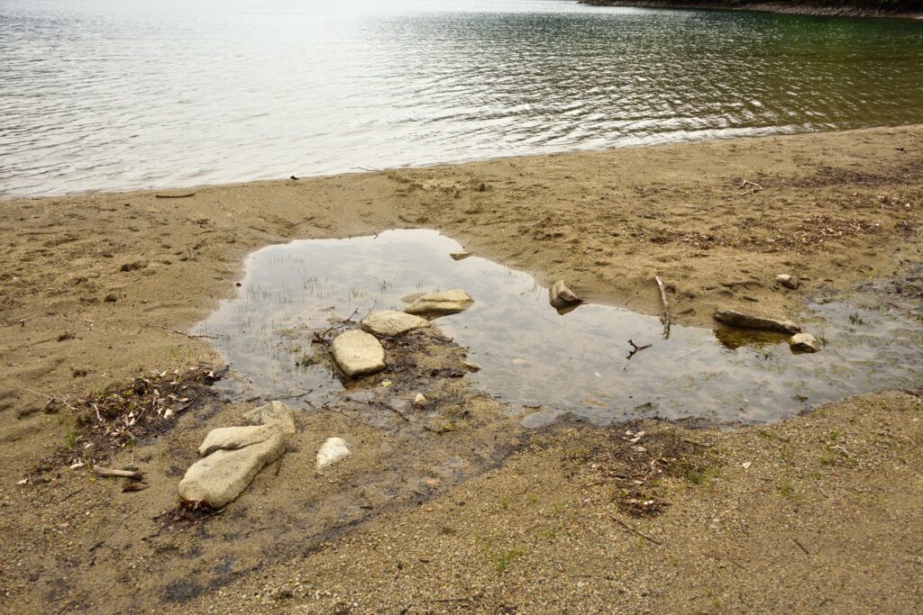 普段は水に沈んでいる場所にできる子の水たまりの中には…