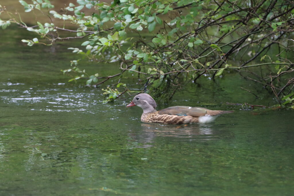 川沿いのホザキシモツケを見ていると上流からオシドリのオスが流れてきました!オスはオレンジ色の美しい姿が有名ですが、繁殖が終わった今は地味なカラーになっています。この時期はクチバシが鮮やかな赤色であることに注目しましょう!