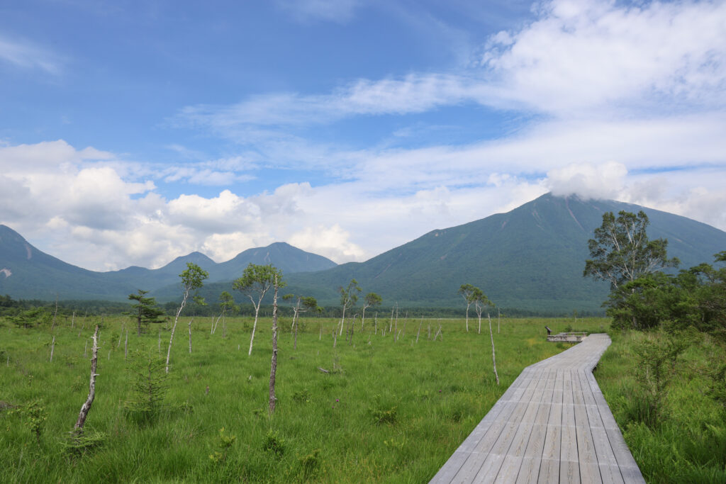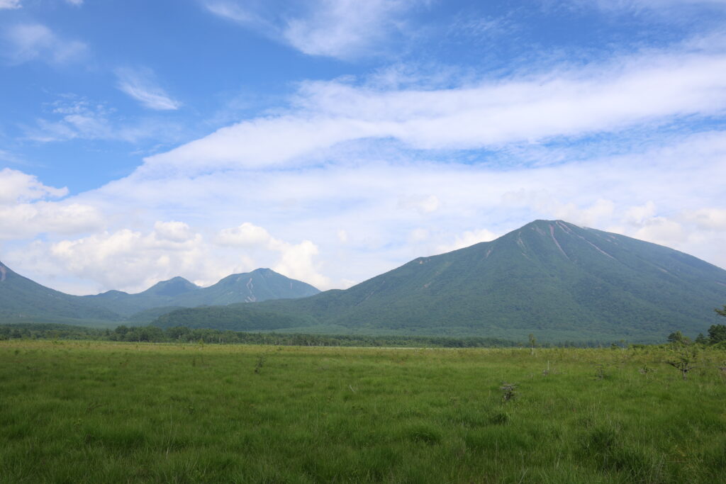 木道入口から30分ほどで戦場ヶ原の展望台に到着!湿原は一面緑に覆われ、青空と雲とのコラボが最高です。
