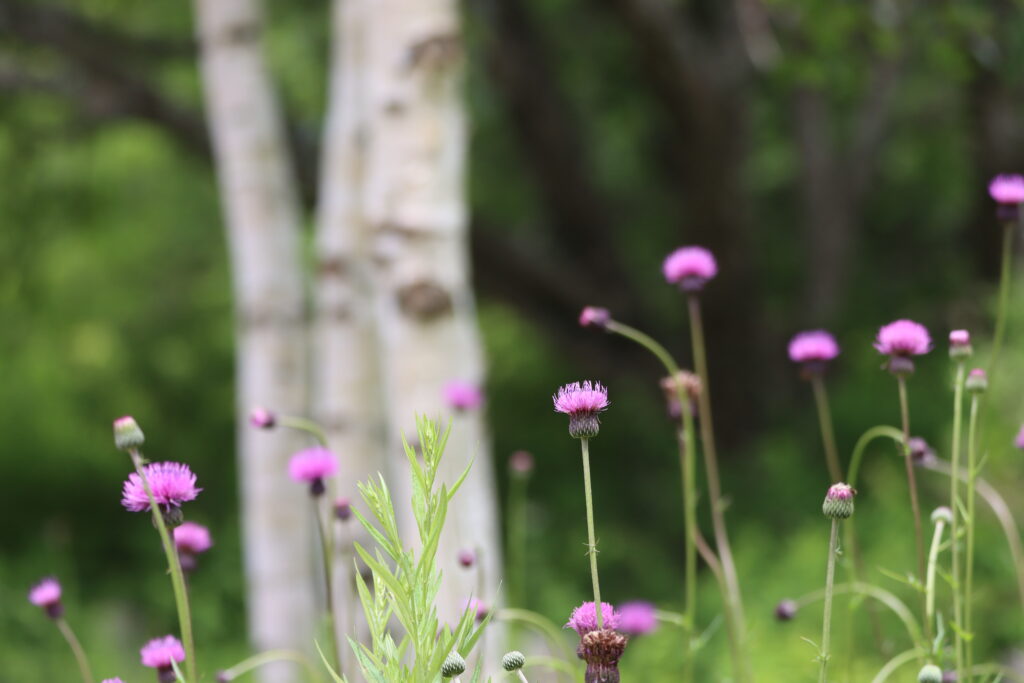 木道入口からすぐの赤沼写真撮影台にはたくさんのノアザミが!