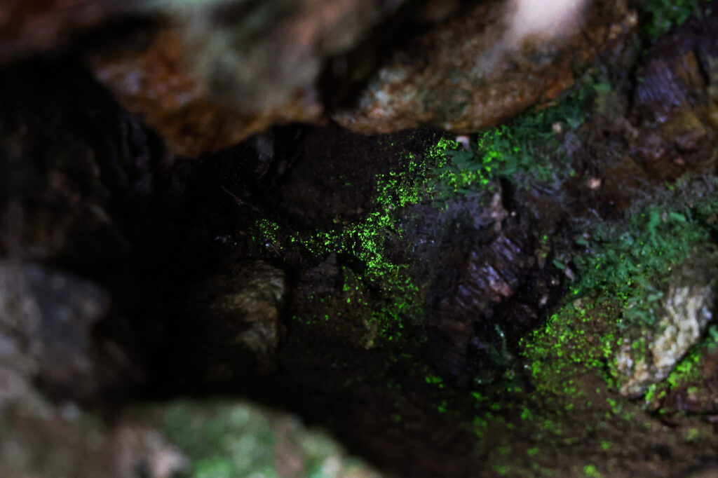 山側の歩道をしばらく歩くと、山の斜面に木の根っこが露出して、たくさん窪みが出来ているところがありました。その窪みの中を覗いてみると、なにやら地面が緑色に光っています!