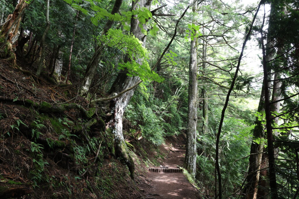 一方山側では木の根っこが地面から飛び出ていたり、湖側が崖になっていたりする為、足元には注意が必要です。