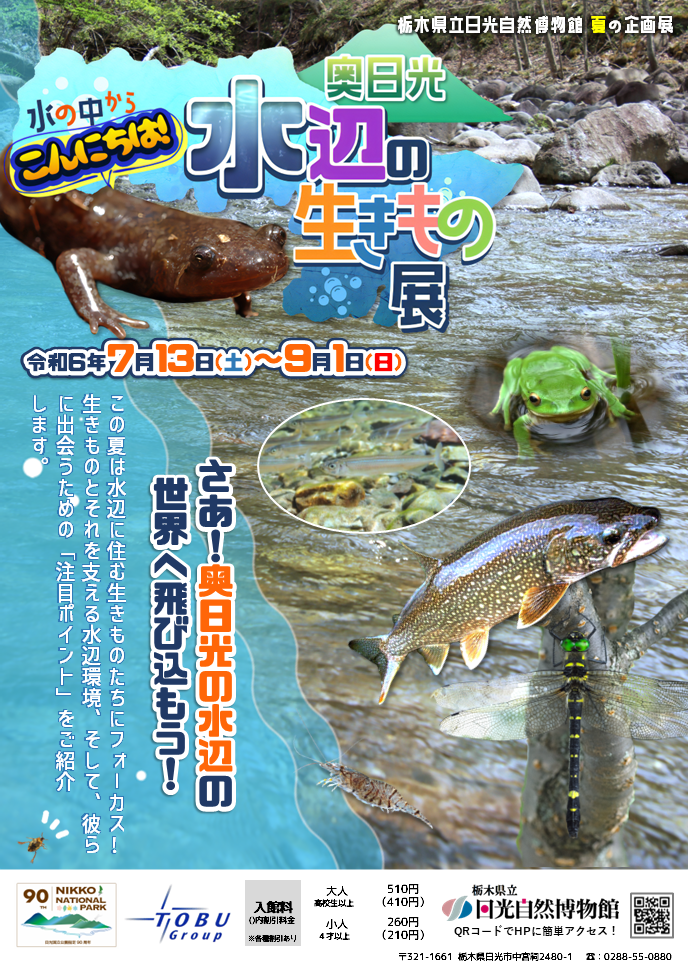 日光自然博物館では、【奥日光 水辺の生き物展】を開催中です。水の中に棲む魚や水生昆虫、また、周辺に棲むカエルやサンショウウオなど、生体の展示が盛沢山!その他にも環境を再現したジオラマや生き物の解説パネルがあるボリューム満点の企画展になっています。見学後に、簡単なアンケートにご協力いただいた方限定で、水辺の生き物のポストカードをプレゼントしております。この機会にぜひ、日光自然博物館にお越しください!