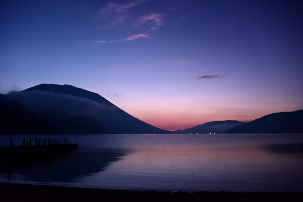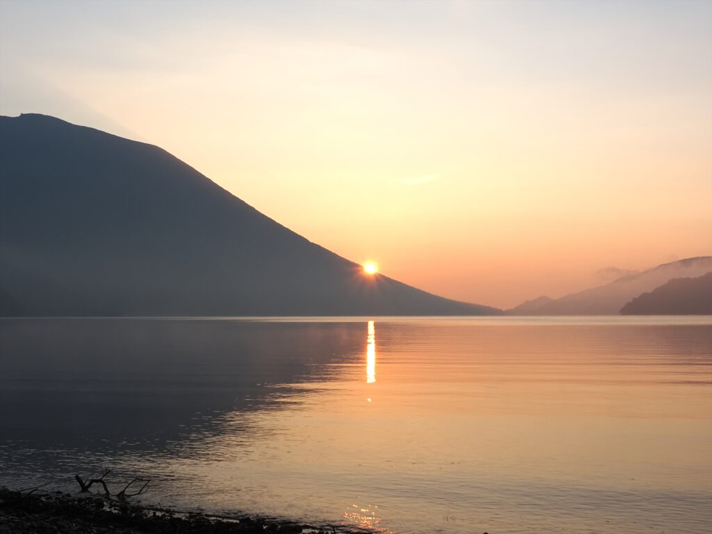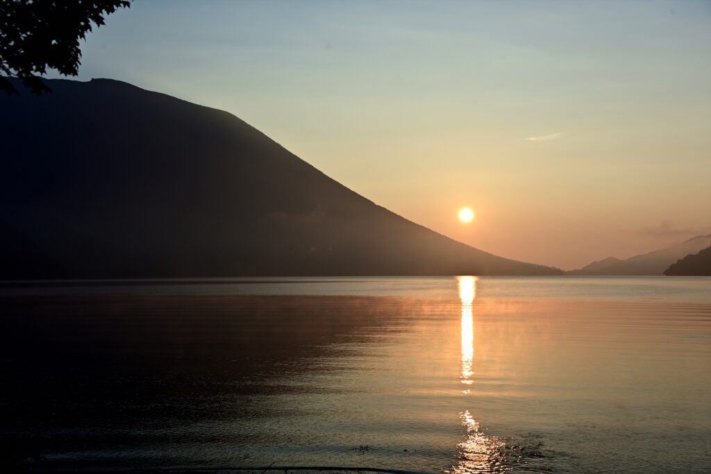 華厳渓谷からの日の出は、太陽が湖面に近いので反射した光が道のように伸びる「光の道」が見どころ!