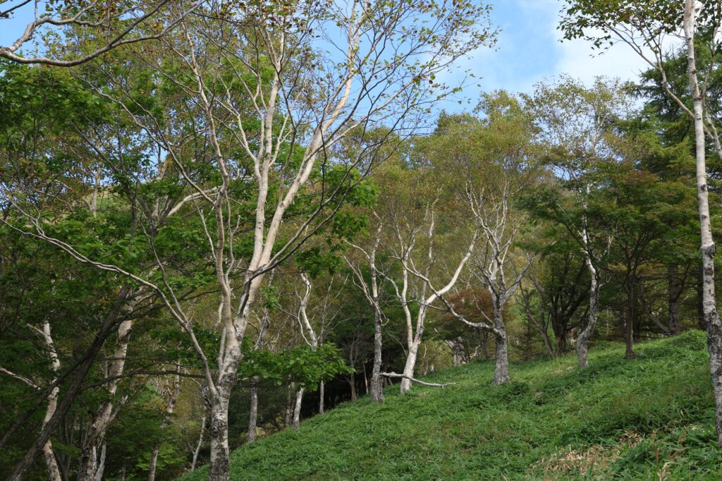 歩き始めてすぐに、奥日光だと標高1500m前後からしか見られないダケカンバの美しい白い樹皮が登山道沿いに目立ってきました。高標高ならではの自然を手軽に味わえるのも半月山の魅力だと思います。