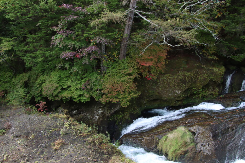 滝上から見ると9月27日に紹介した時と大きくは変わりませんが、より流れに近いツツジたちの色づきは進んでいるように感じます。