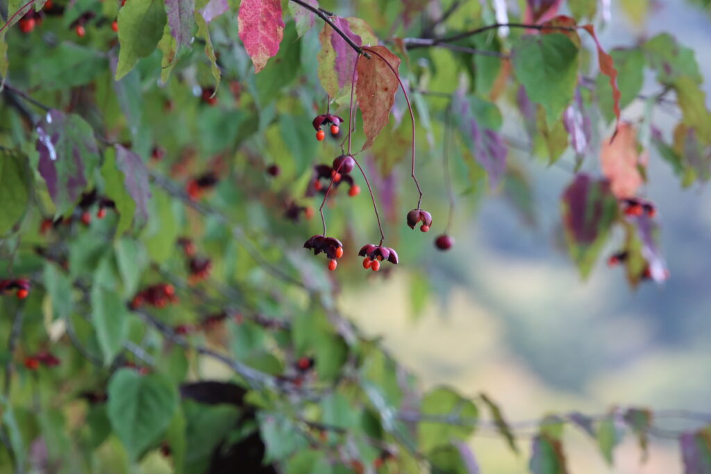 こちらはツリバナの実。深紅色の実がパカッと割れてオレンジ色の果肉が出てくるというユニークな形をしています。