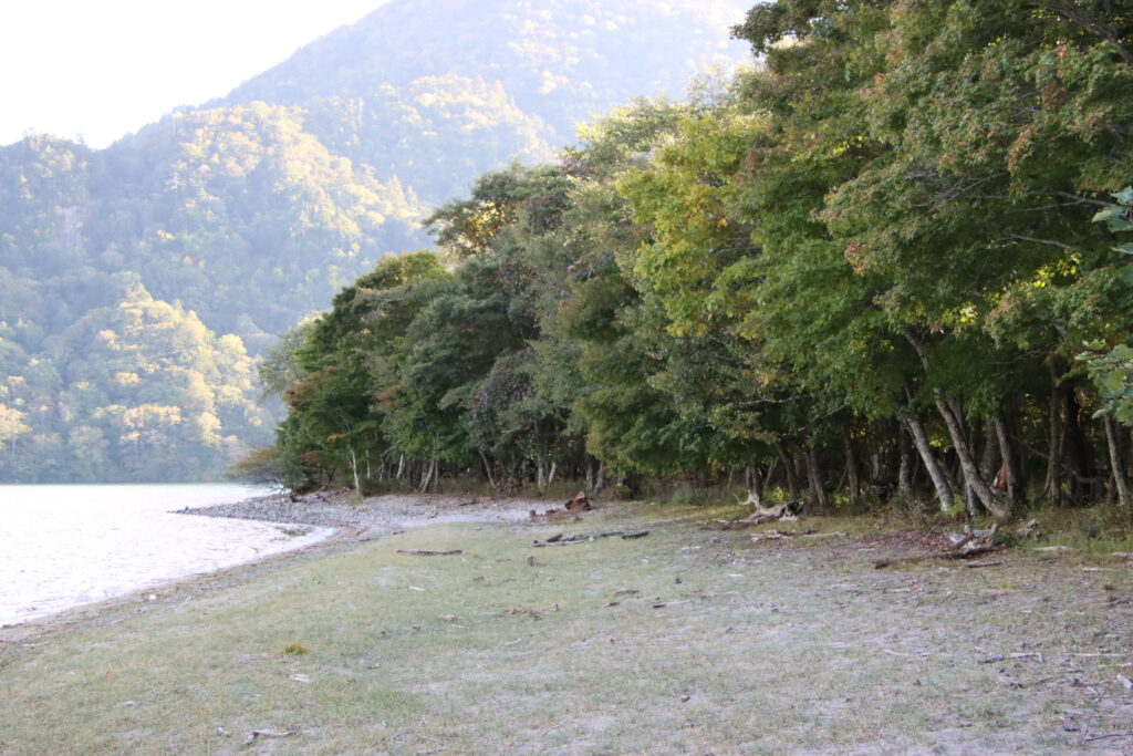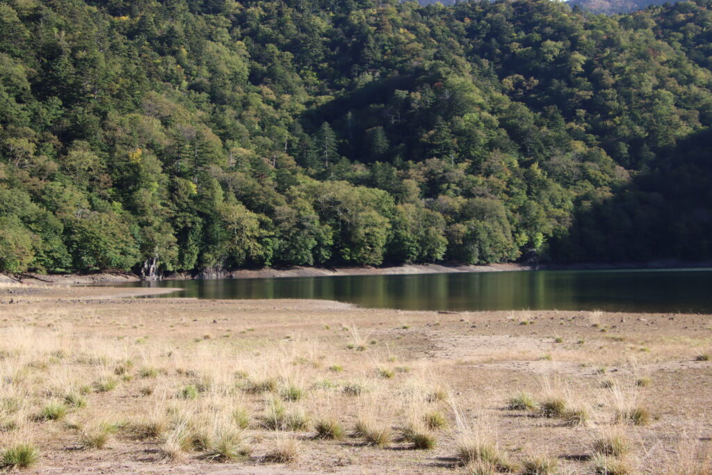 湖畔の木々はまだ色づきも進んでいない状態。