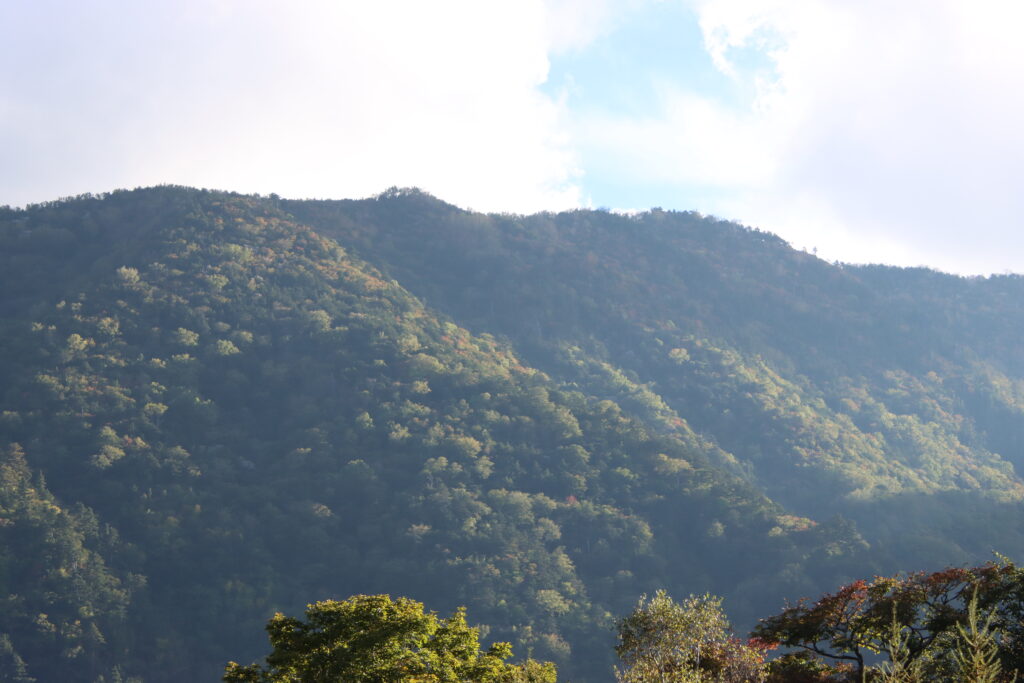 紅葉の進行状況としては正面の山の斜面上部では色づき始めて木々が見受けられますが…