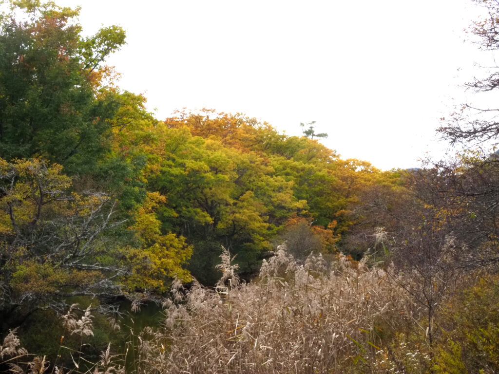 まず戦場ヶ原は木道沿いから湯川対岸のミズナラの様子。