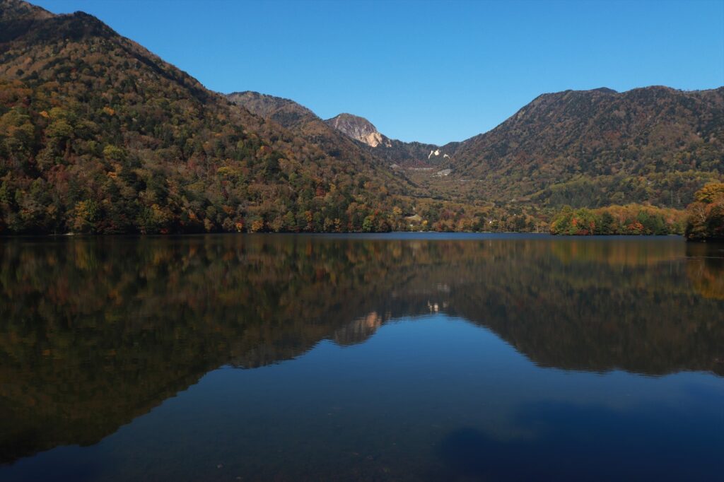 湖尻。取材時は風が少なく、湖面に紅葉が映っていました!