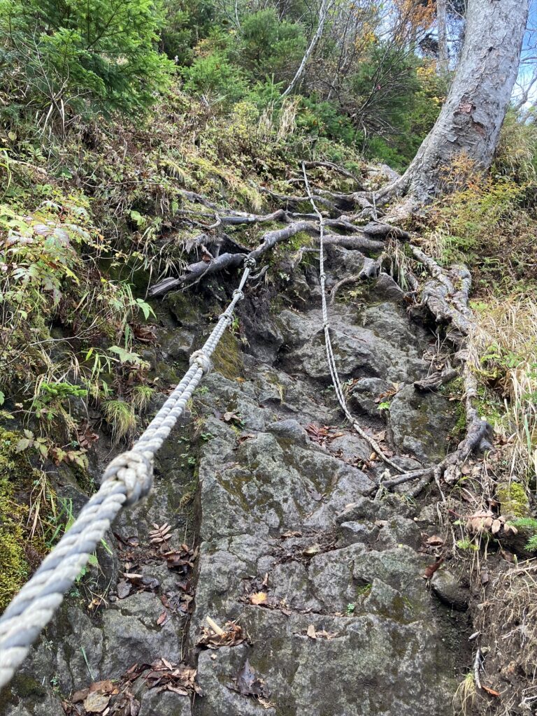 今回歩いたコースは、下の写真のようなロープを掴みながらでないと上り下りできない傾斜や崖の上を歩く細い道、石や木の根なども多くあります。