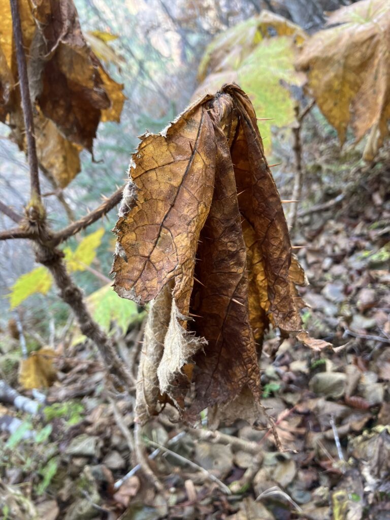 遊びと言うのは、落ち葉めくりです。枯れて丸まったフキなどの大きな葉っぱや針葉樹の枝の上に積もった落ち葉を神経衰弱のようにめくり、中にいる生き物を観察する遊びです。冬眠前の生き物が風や寒さを凌いだり、夜の活動する生き物の隠れ家となっています。