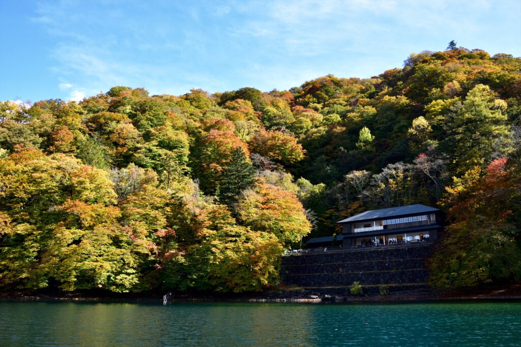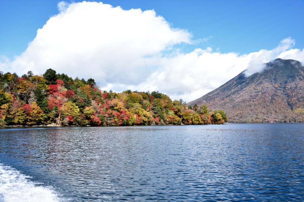 中禅寺湖畔の紅葉は今が盛り。湖面近くまでしっかりと色づいており、湖の青色と紅葉の鮮やかなコントラストや、水面に映り込む紅葉など、湖畔の紅葉ならではの景色もお楽しみいただけます。