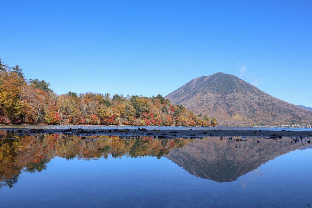 浜辺にできた水たまりに顔を近づけると、紅葉と男体山が鏡写しに!