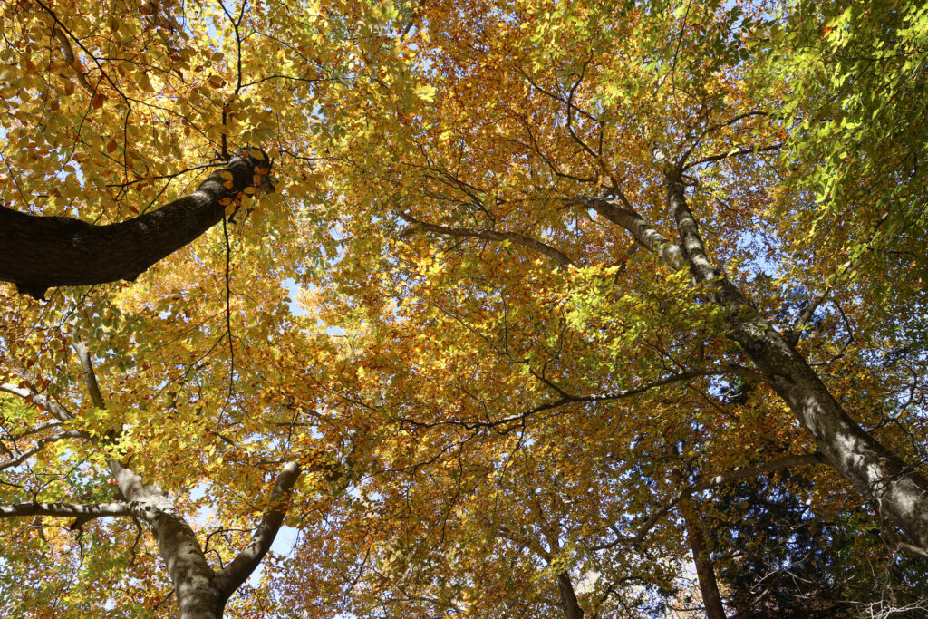 森の中で上を見上げてみると、視界いっぱいのブナの黄葉!
