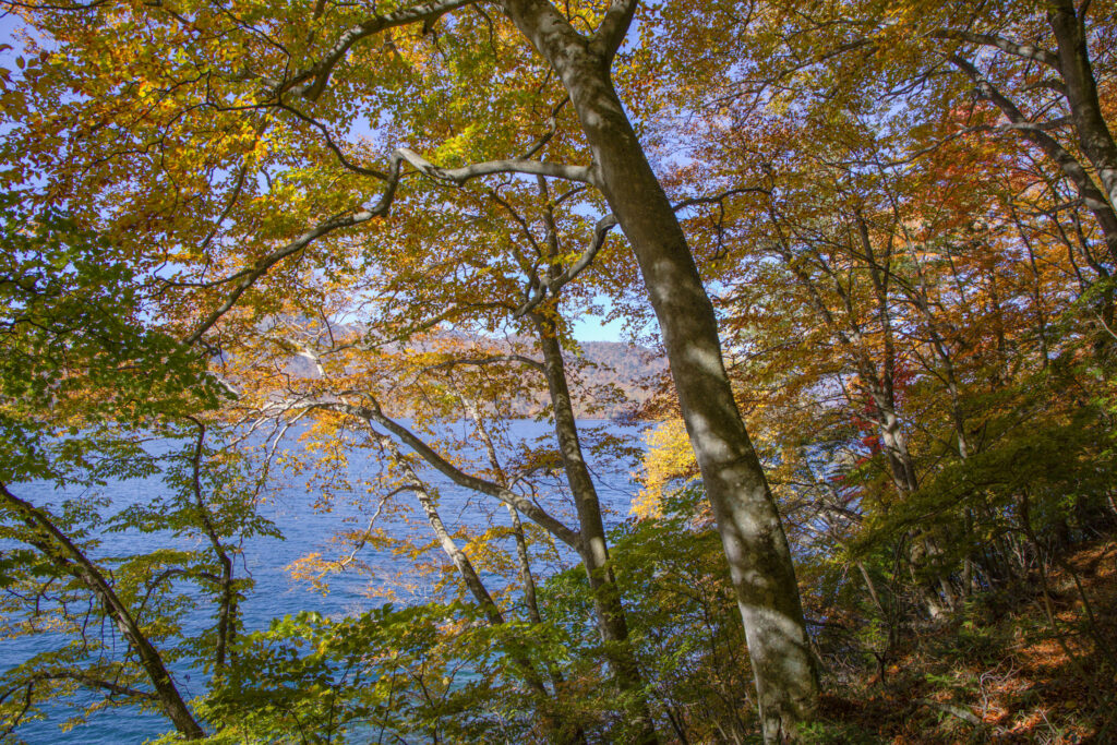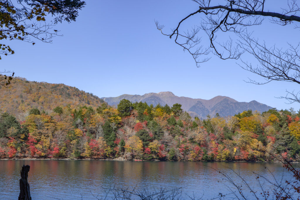 ここまででも紅葉を楽しむには十分ですが、大使館別荘記念公園から20分程歩いた狸窪(むじなくぼ)からは八丁出島と男体山のコラボを楽しむ事ができます!