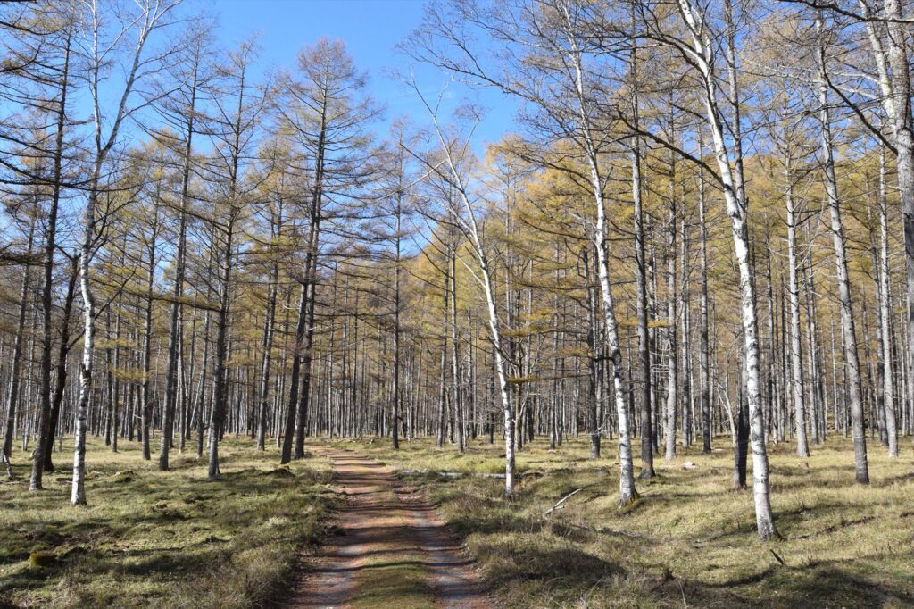 西ノ湖バス停入口から西ノ湖の道中にはカラマツの林が広がっています。