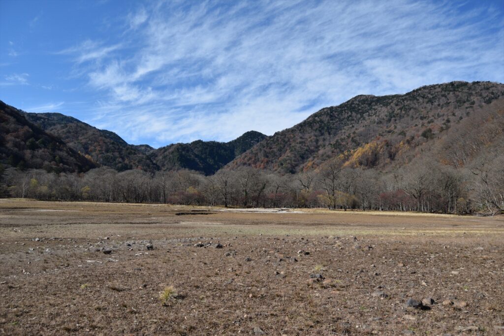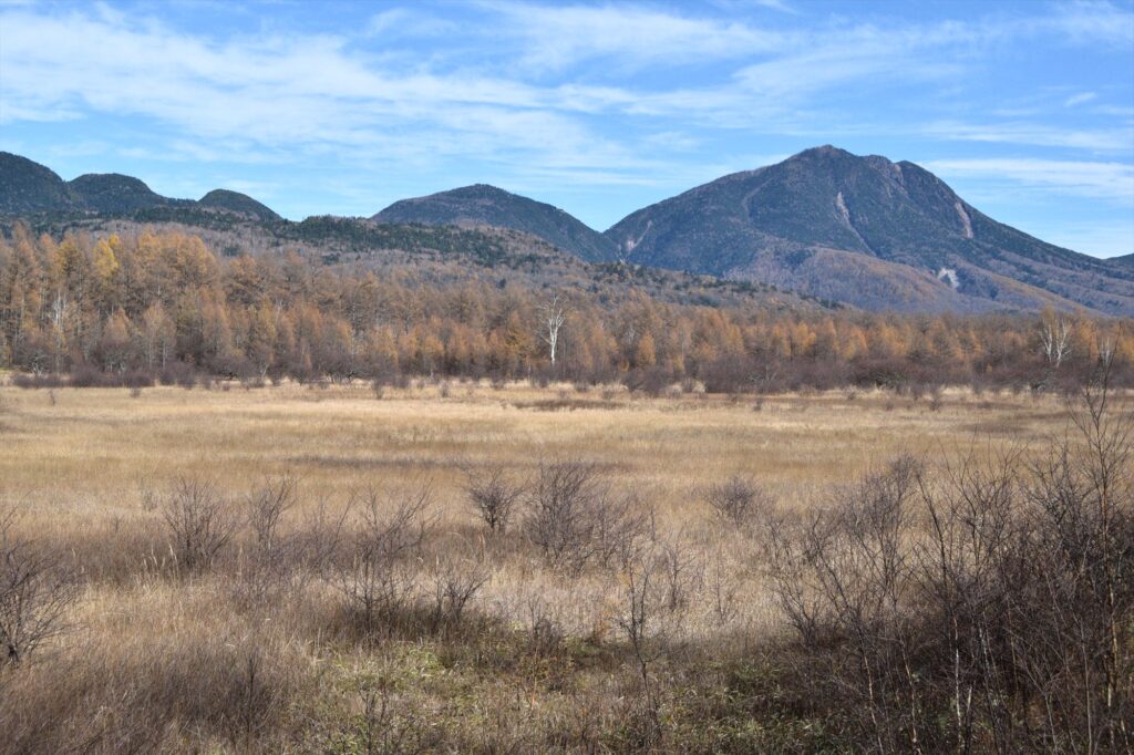 小田代原のカラマツは葉が落ちている木が多く、黄色味が薄くなり、紅葉が終わりに近づいていました。