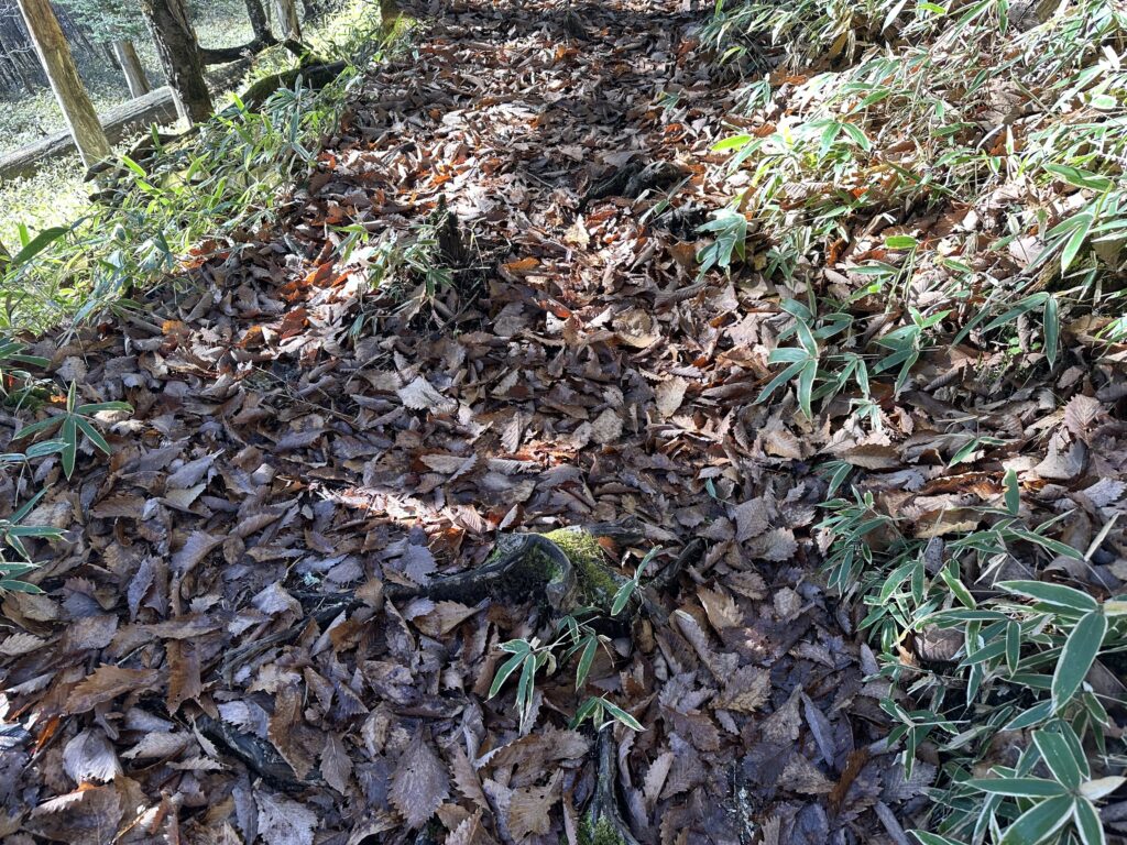 光徳から北戦場に抜ける道では、落ち葉の下に根っこや石が隠れていることがよくあります。