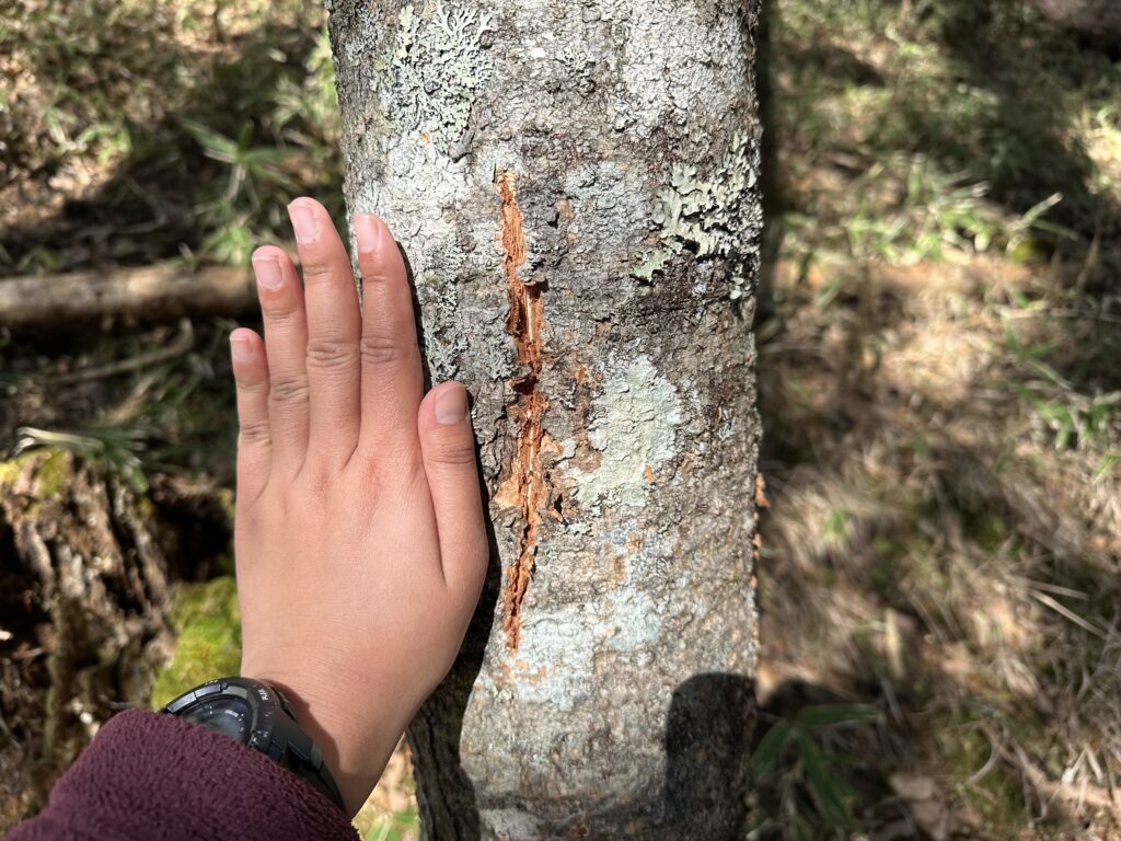 これはシカが角を研いだ後です。シカは毎年春に角が生え変わりますが、初めは角の周りに皮膚がついていて