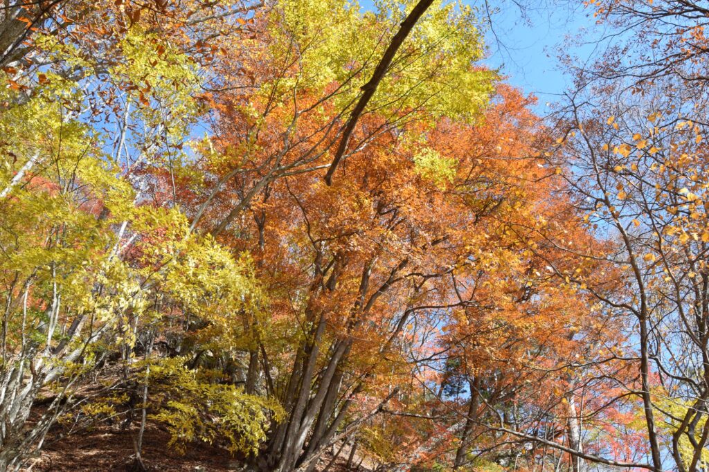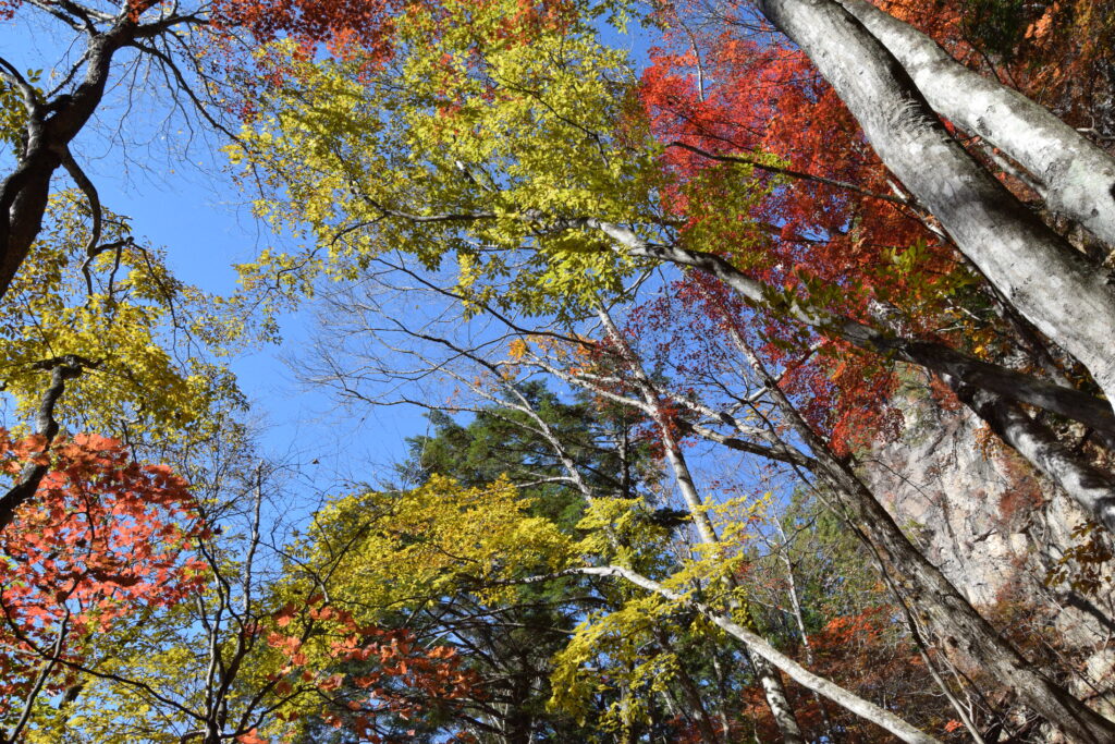カエデ類の赤とブナのオレンジ、ミズナラの黄葉が入り混じり、日差しが差し込むと幻想的です。