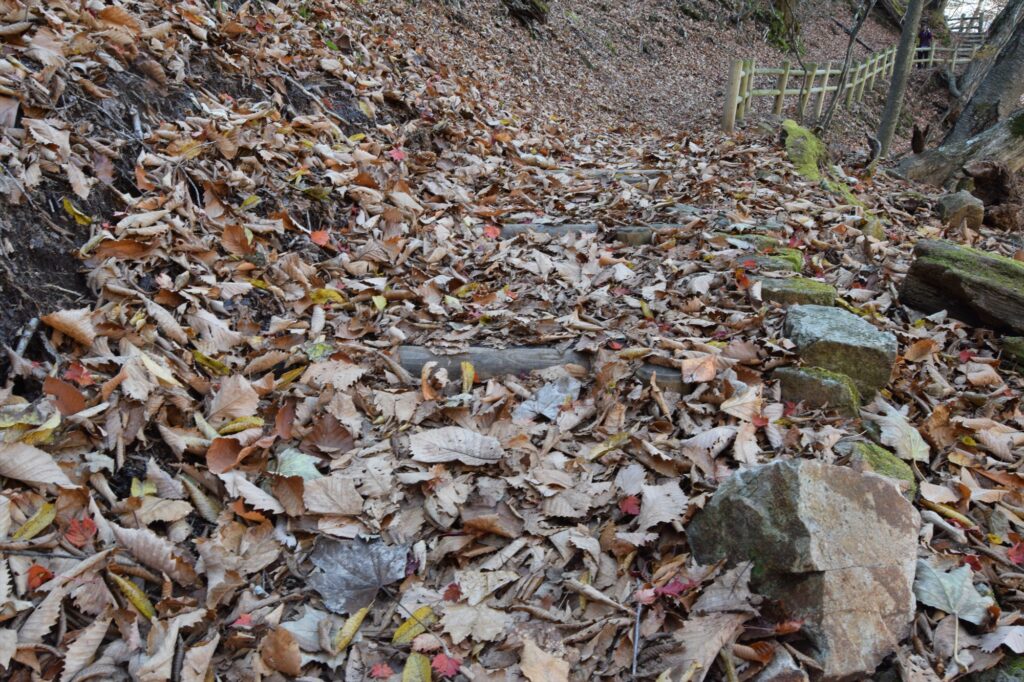 生き物や紅葉に気を取られてしまいがちですが、遊歩道では枯葉が多く積もっていて、階段や木の根を覆っている場所が多くあります。