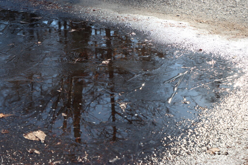 取材日の赤沼の気温は9時時点で2℃、駐車場の水たまりには氷が張っていました!