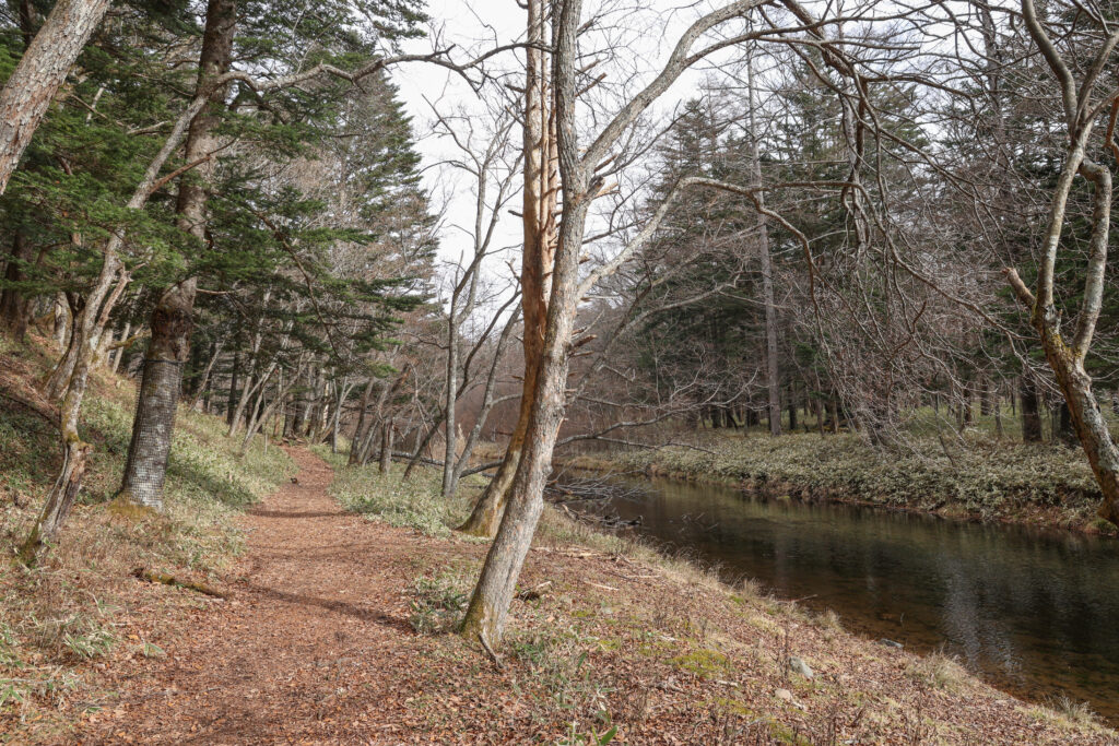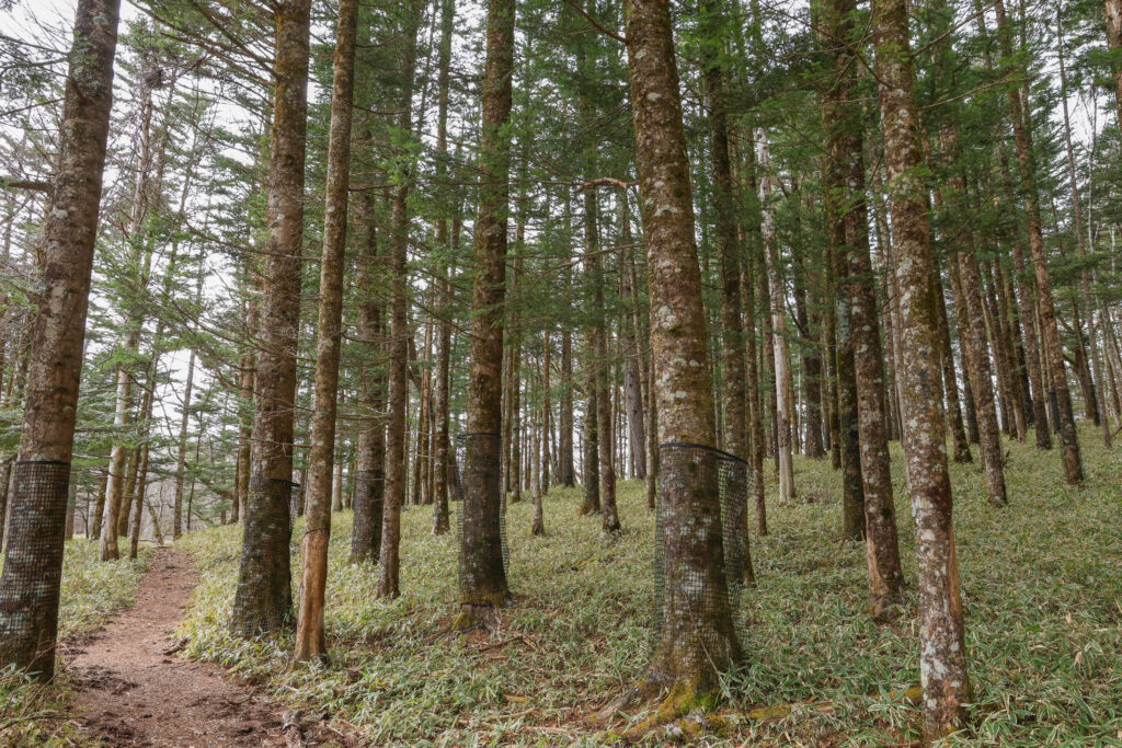 光徳沼を越えて10分ほど歩くとウラジロモミが増えてきます。針葉樹であるウラジロモミの森はこの時期でも葉を茂らせていて、静かで深い森の雰囲気を堪能できました。