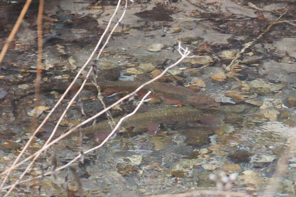 カワマスです。寒さが厳しくなり始める今の時期はちょうど産卵の時期のようで、繁殖期ならではの鮮やかなオレンジ色のお腹をしたオスが、川底でメスに寄り添うように泳いでいました。まさに産卵が行われる直前だったのかもしれません。