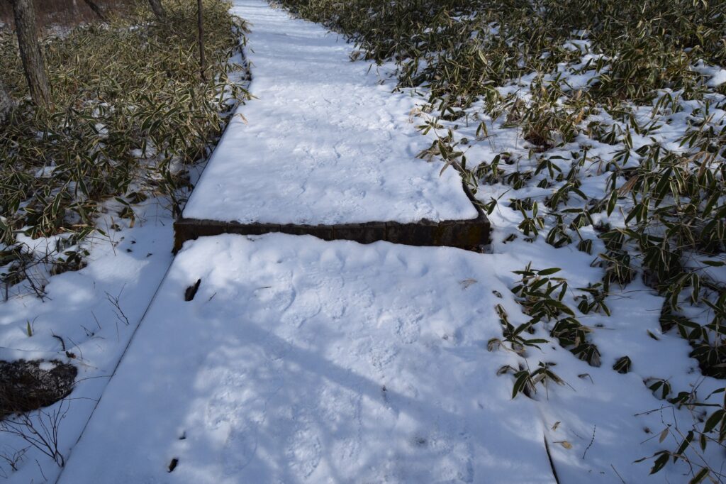 傾斜のある木道では、滑り止めの間に雪や氷が積もっていて、スロープ状になっています。