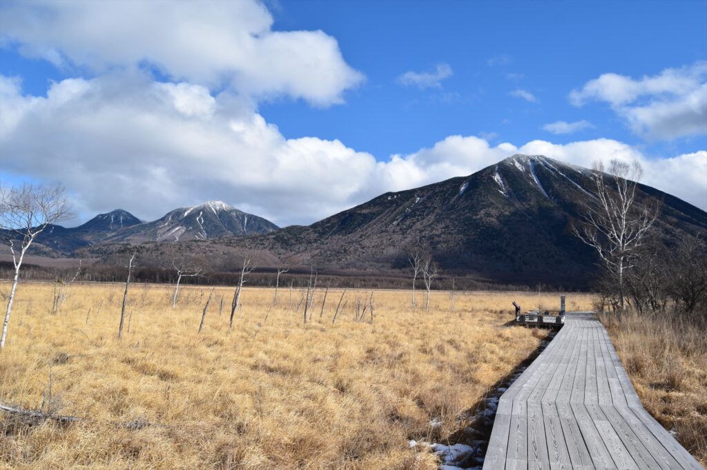 積雪した木道を歩く際にチェーンスパイクなどの装備があると氷上でも安心です。ただし、木道上で使用する際、スパイクの歯によって木道を傷めてしまう恐れがあります。積雪や凍結の状況に応じてチェーンスパイクの着脱をお願いいたします。