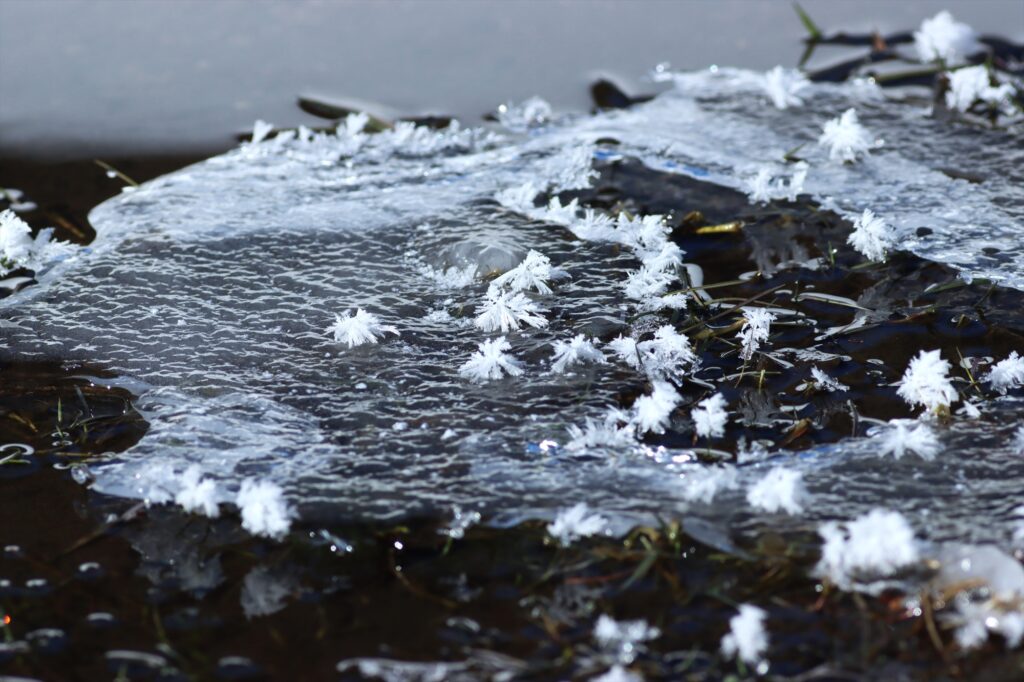 フロストフラワーは水蒸気が氷の上で凍り付いて結晶化した後に徐々に成長することで、まるで花のような結晶になる現象です。風が吹いていない、氷の上に雪が積もっていない、気温が-15℃前後まで冷え込むなど様々な条件が揃わないと見られない珍しい光景。
