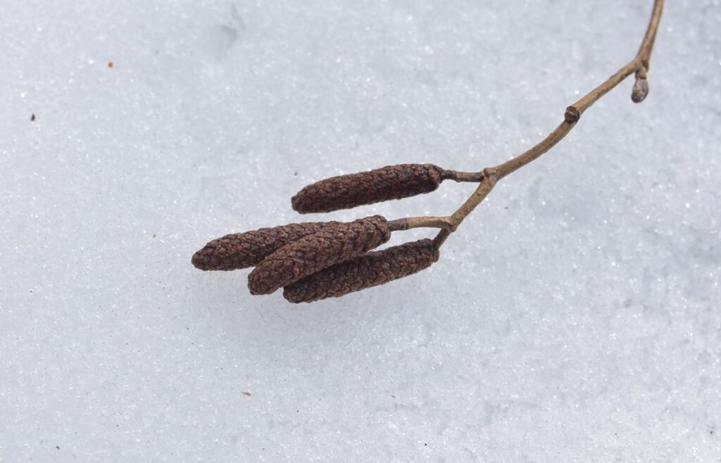 カルパスのように見えたのは、ハンノキの仲間の果穂(かすい)です。果穂とは小さな果実が集まり穂のようになった物です。赤茶色で、形が細長い筒状になっているので、遠目からみるとカルパスが落ちているかのように見えてしまいました。