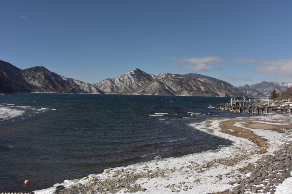 冬の中禅寺湖は風が強く吹き付け、荒々しい波が次々と打ち寄せます。