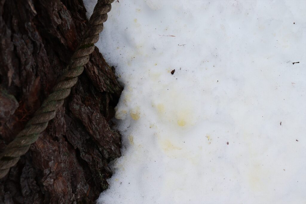 積もっている雪もさらさらの粉雪ではなく湿った雪で、少しずつ春が近づいていることを感じますが、景色としてはまだまだ冬。踏み固められていないところを歩くと膝まで沈んでしまうほど雪が残っています。そんな雪の森の中で黄色くなった雪を見つけました。