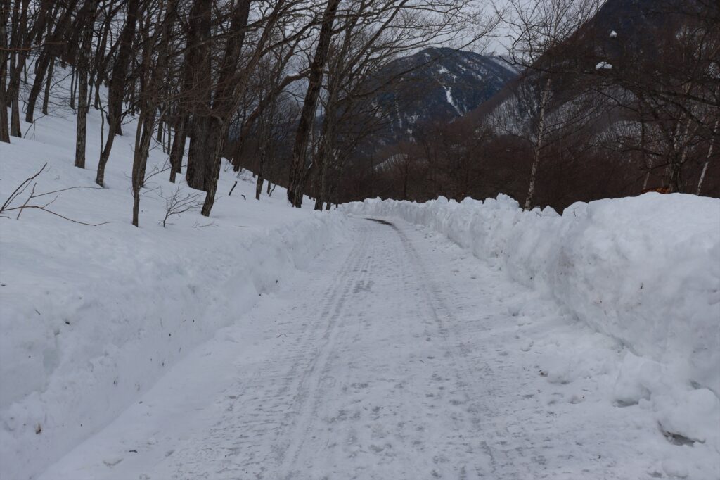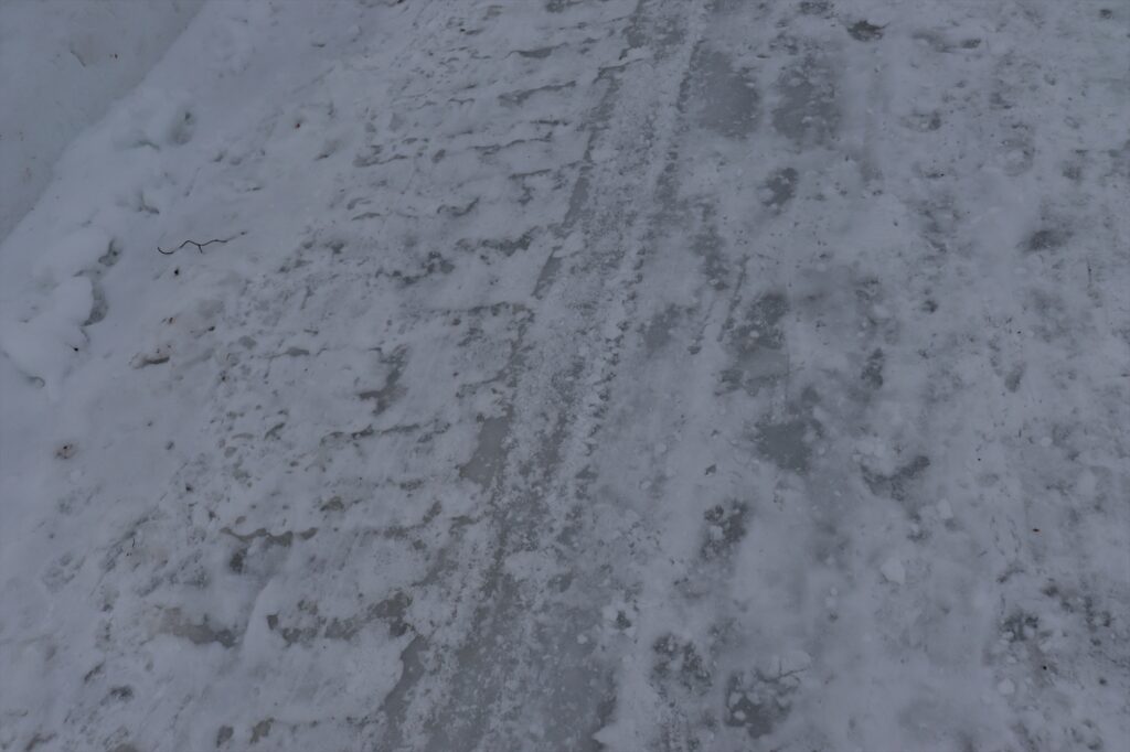 しかし、今回のコースには一部道路を歩く場面があり、そこでは一度解けた雪が凍って滑りやすくなっています。チェーンスパイクなどの滑り止めが必要です。