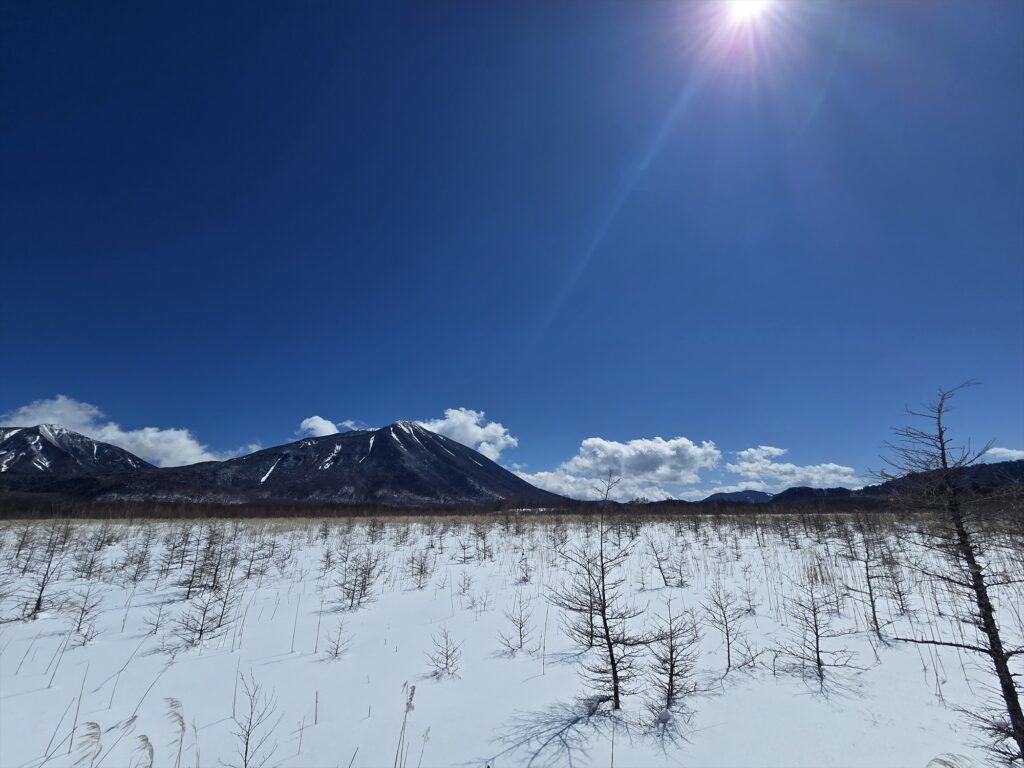 人工物のほとんどない雪原と澄み渡る青空、周りを囲む奥日光の山々を一度に眺めるこの景色は