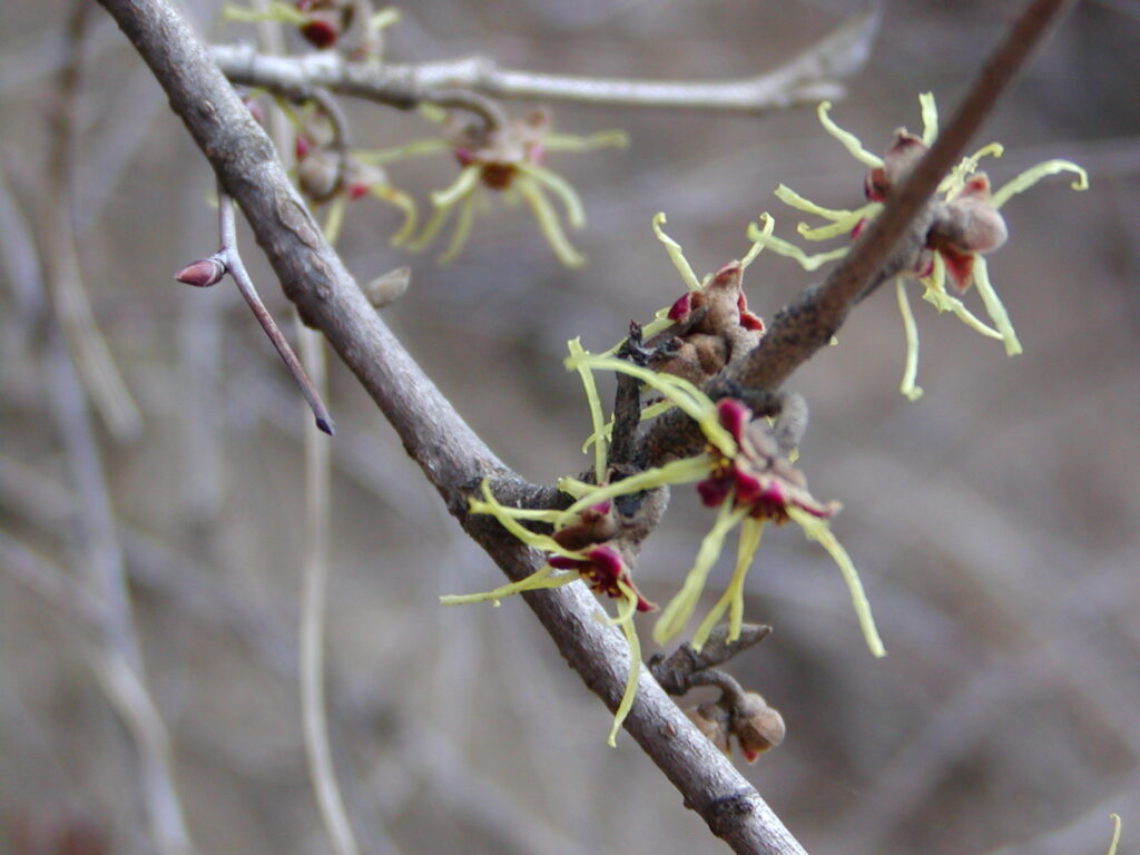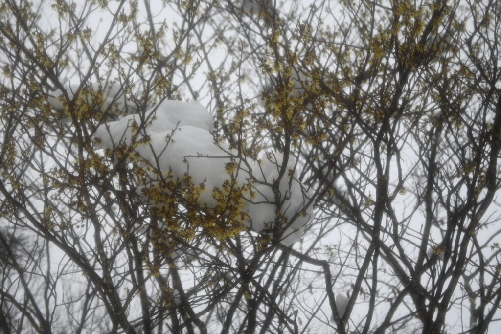 マンサクという花です。花ひとつは3cmほどで、細長い紐状の花弁がついています。咲き始めはくるくると丸まっているのですが、