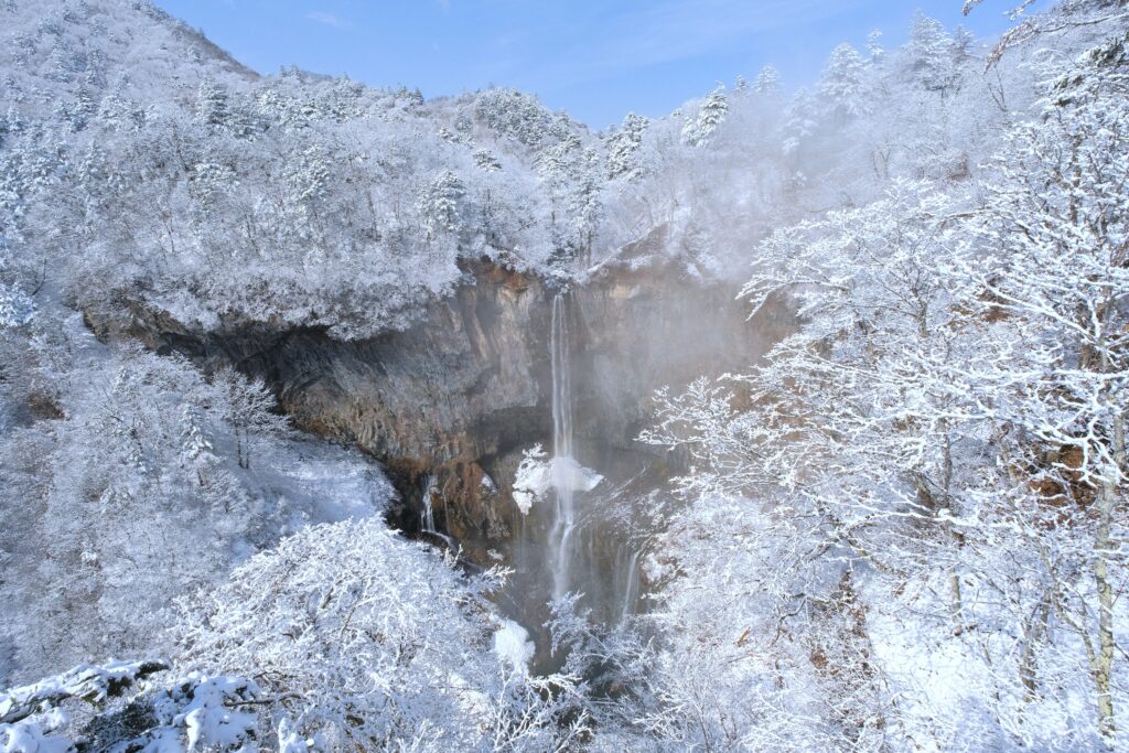 先週末も大雪がどかっと降り、その時は一面の銀世界と青空、さらには虹までかかった華厳滝を見ることができたんです。