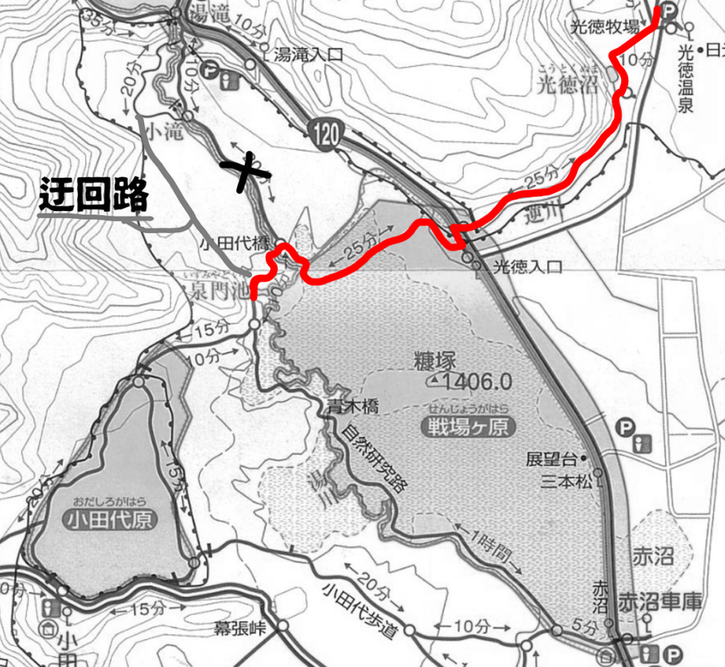 今回は、光徳~戦場ヶ原北側~泉門池(赤線部)まで歩いてきました。
