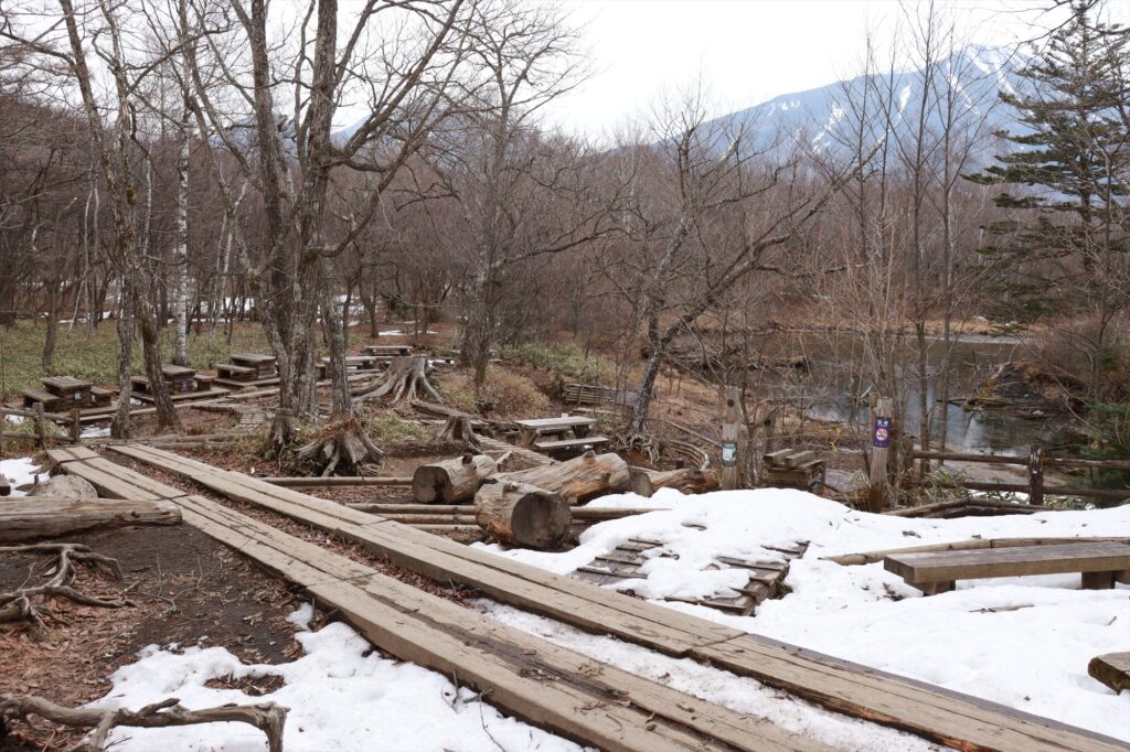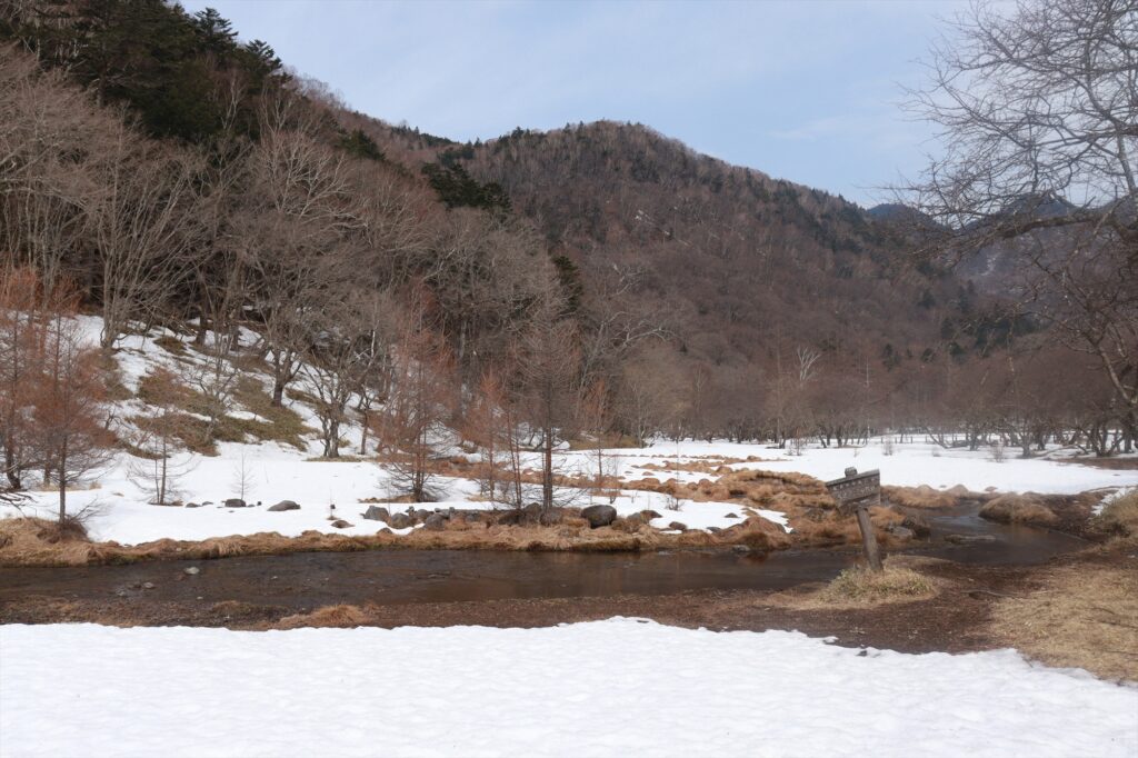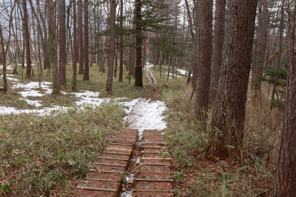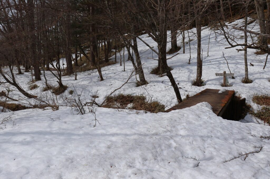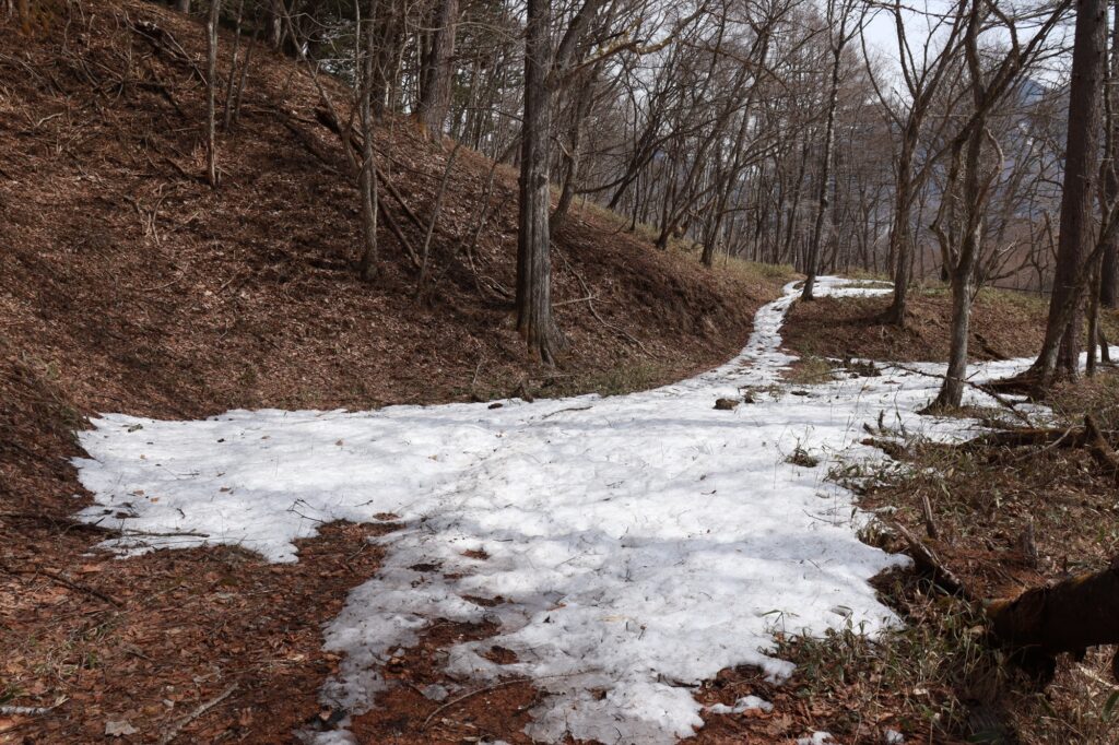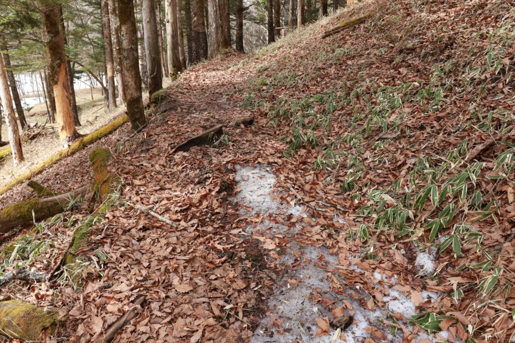 橋を渡ると、逆川を左手に見ながら森の中を歩くことになります。橋から道路に出るまでの森の中の道は7割ほど雪は融けていますが、雪が残っている所では足首まで沈みます。普通のスニーカーだと靴の中に雪が入ってしまうでしょう。
