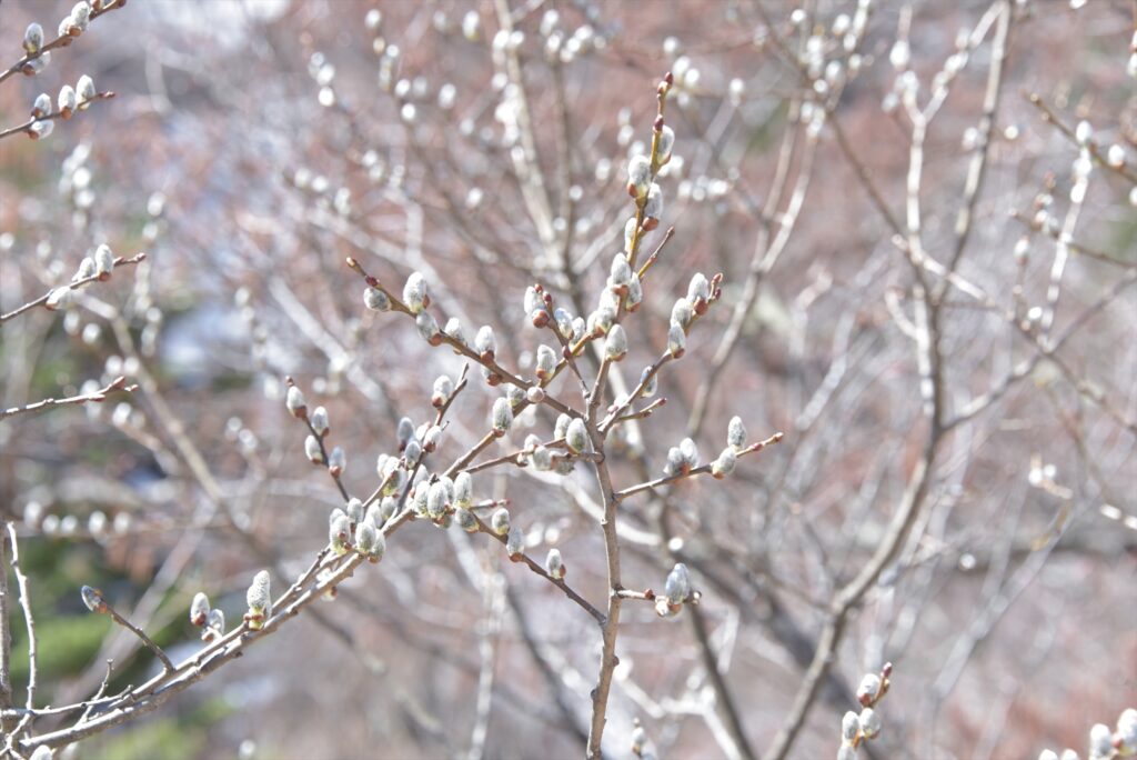 スタート地点の1300m付近では、まだ道端に残雪があり、木々の新芽もなく、春真っ先に咲くマンサクの花や白い毛で覆われたヤナギの芽等が見られる程度で、まだまだ春というには遠い景色が広がっていました。