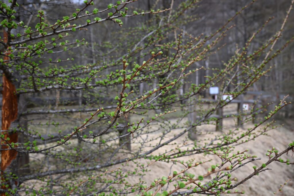 カラマツの新しい葉が成長中!遠目から見ても景色にほんのり緑を加えてくれる存在です。