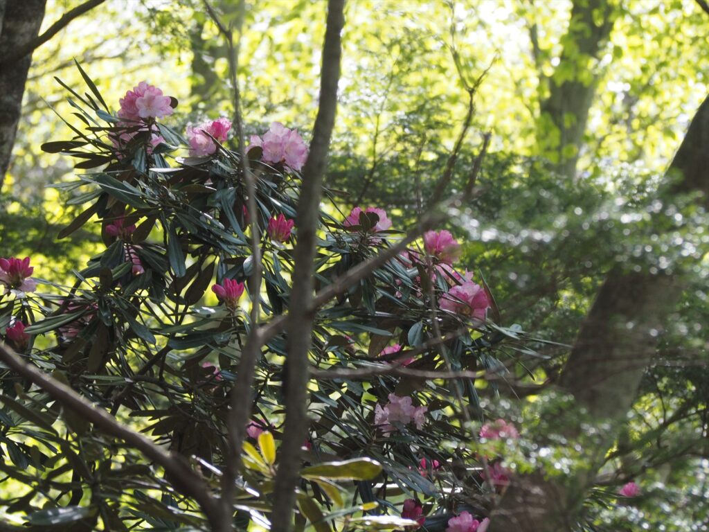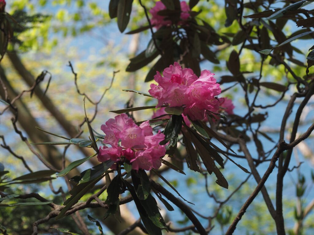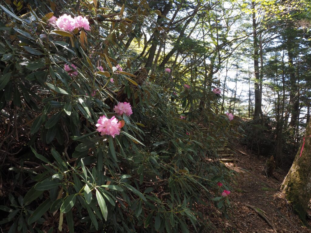 遊歩道の斜面上に大きな群落があるため、花自体はあまり近くにはないものの、シャクナゲに包まれた空間でトレッキングを楽しめそうです。