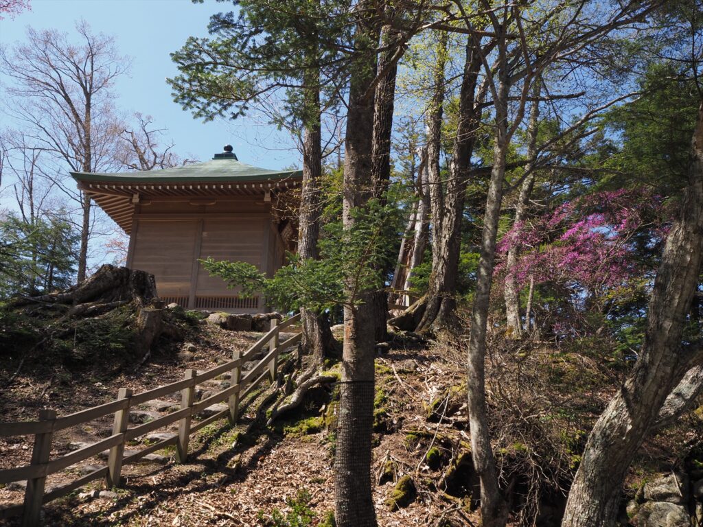 千手堂の階段を降りて振り返ると、ここでもトウゴクミツバツツジが見頃。